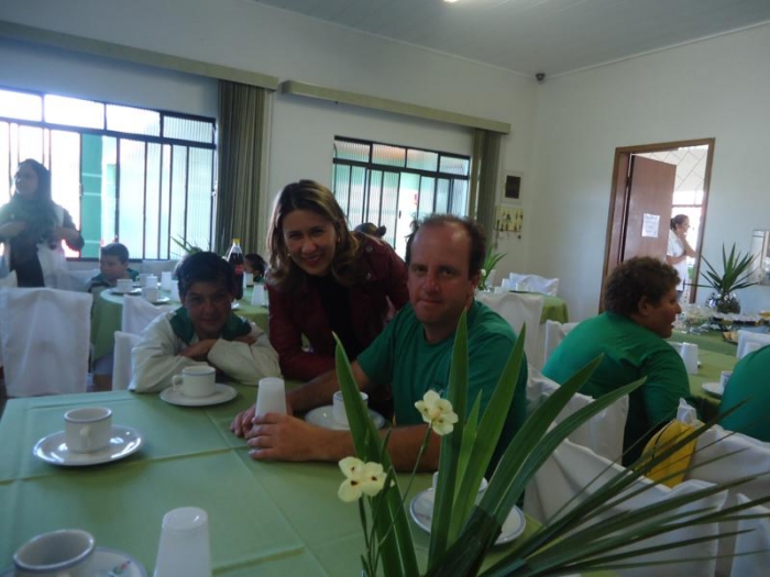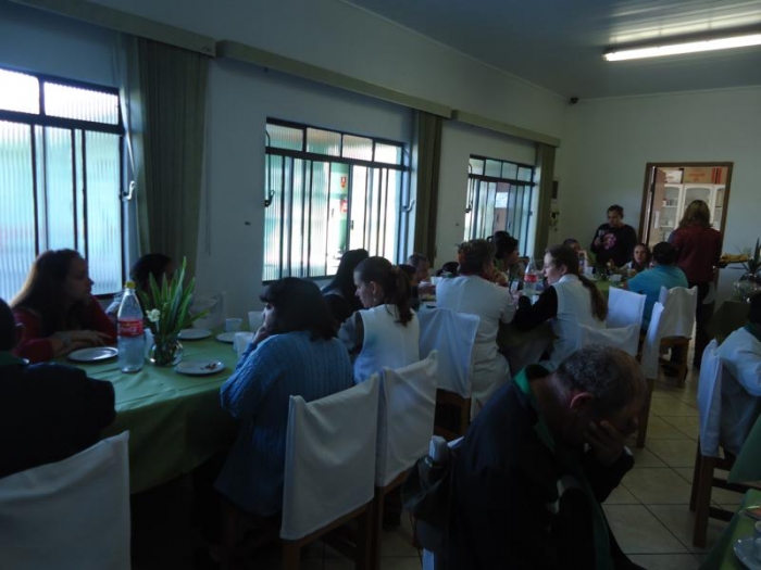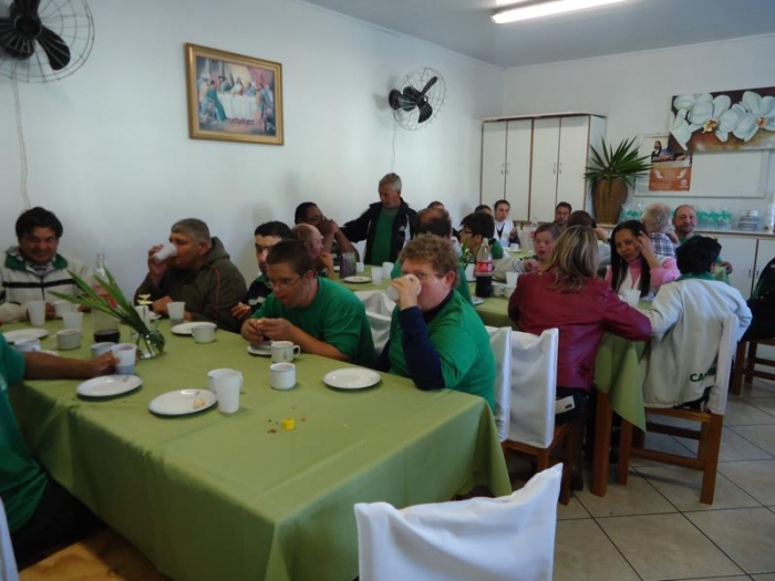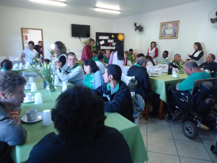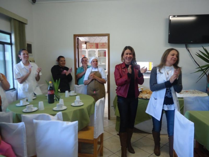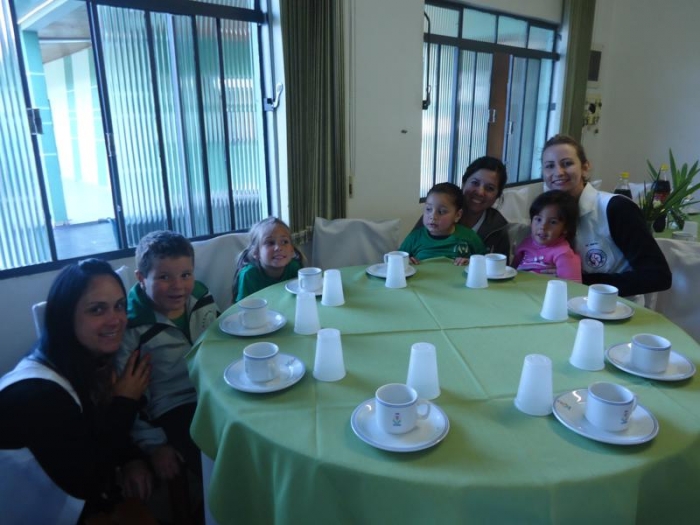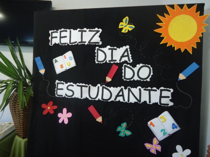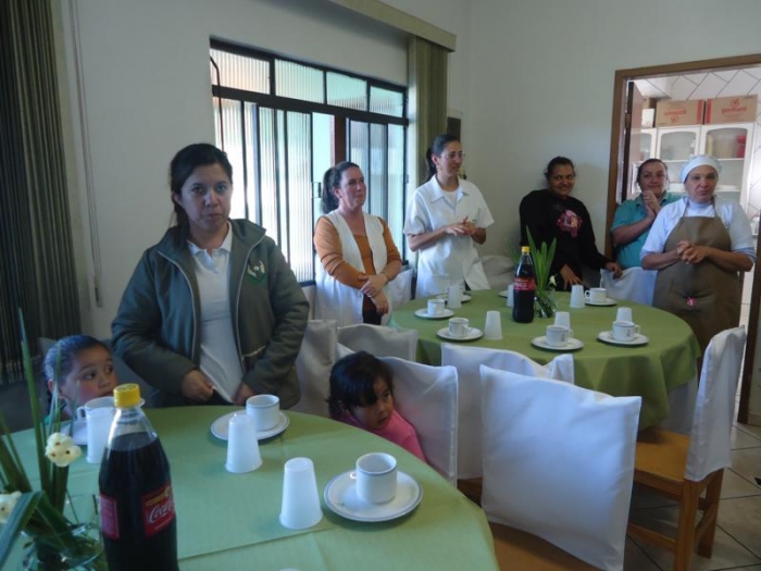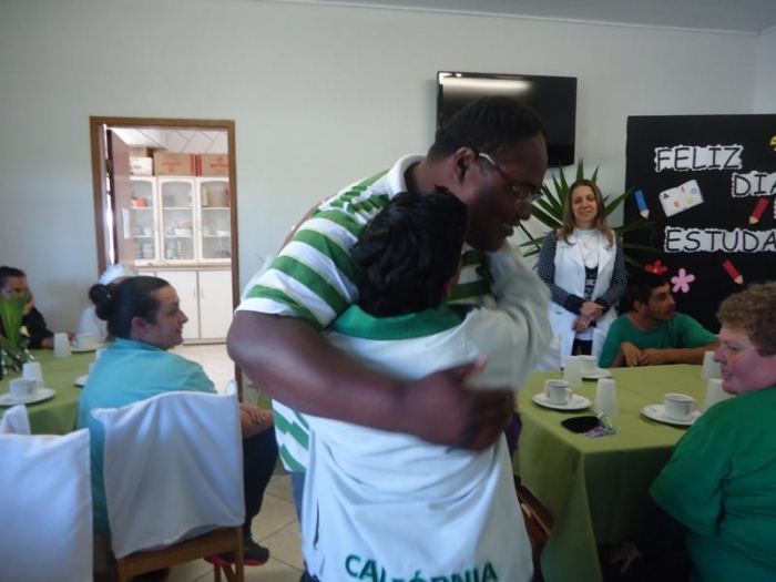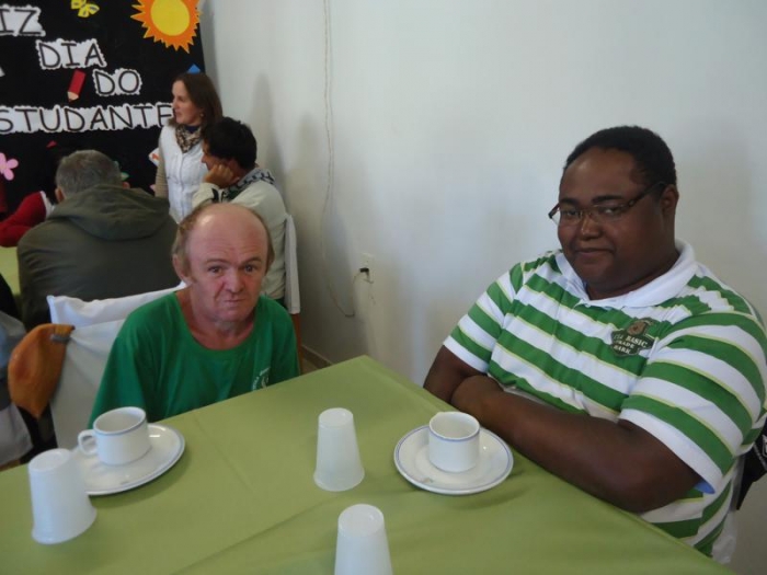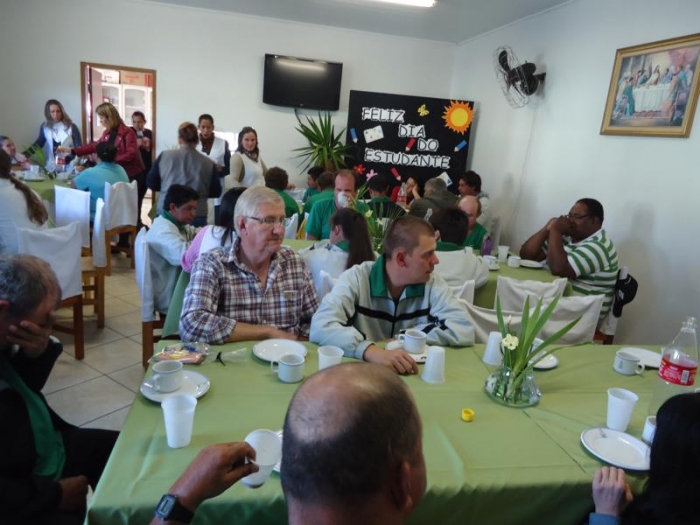 Alunos e funcionários participam de um café da tarde em comemoração ao Dia do Estudante