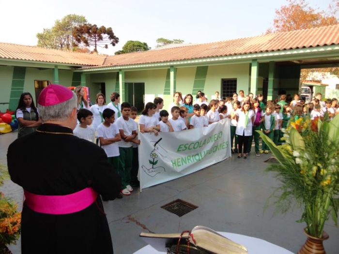 Dom Celso foi saudado pelos funcionários e alunos das duas escolas Joana C. Portelinha e Escola Diego Henrique Gomes.