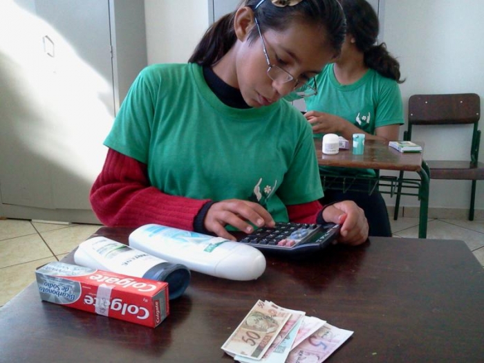 Neste bimestre os alunos do Ensino Fundamental da professora Vanirce na área da matemática, estão trabalhando o conteúdo Sistema Monetário. Desta forma, construíram um mercadinho com produtos mais usados no dia a dia, e utilizaram dinheiro de papel, calculadora, aprendendo o valor por extenso, socializando suas descobertas a partir do valor aproximado dos produtos, reconhecendo cédulas e moedas e com elas simulando compras em sala de aula.