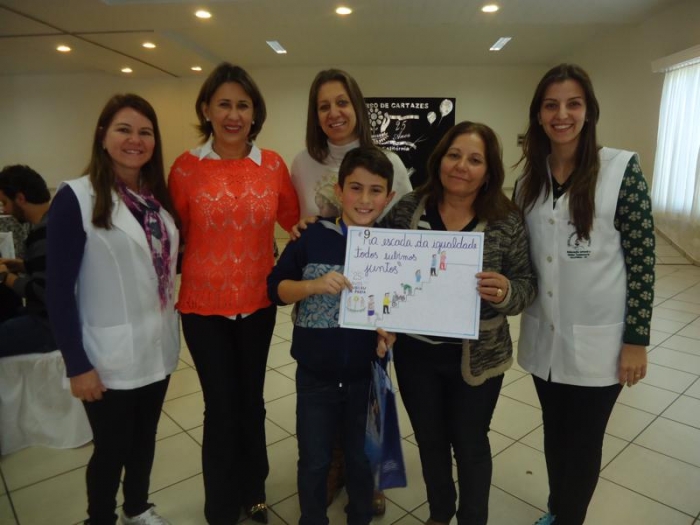 Os jurados escolheram o cartaz vencedor que recebeu um aparelho celular das mãos da Secretária da Educação Maria Stela dos Santos.
