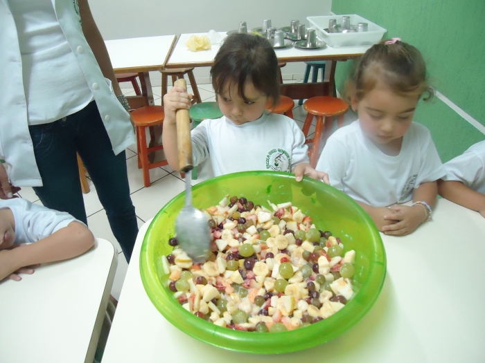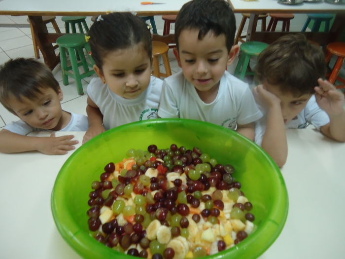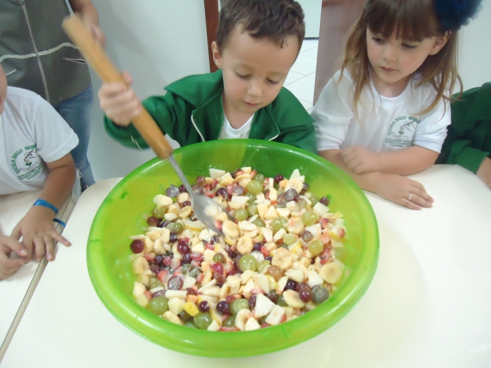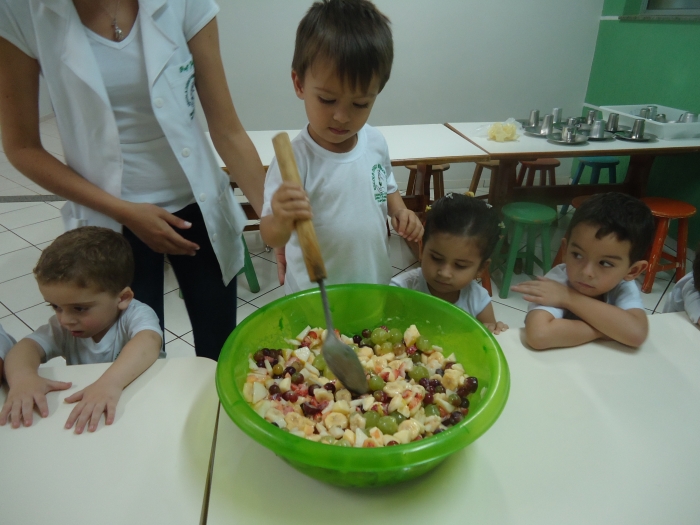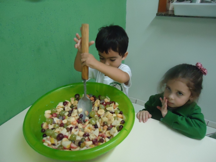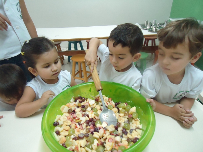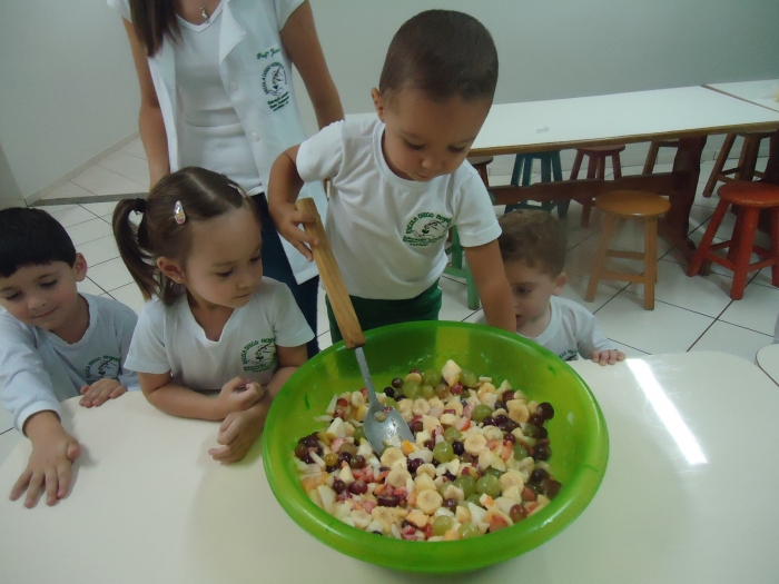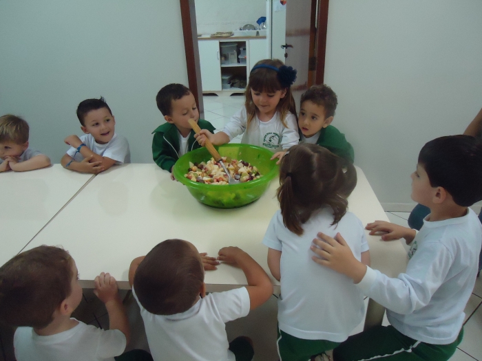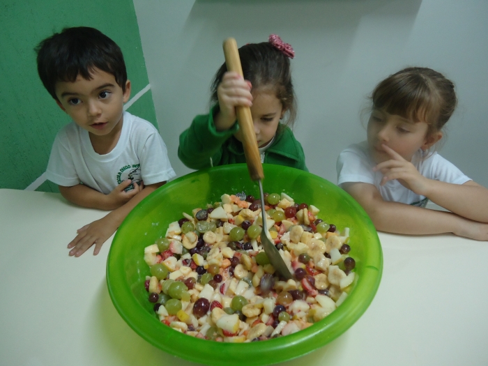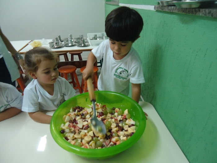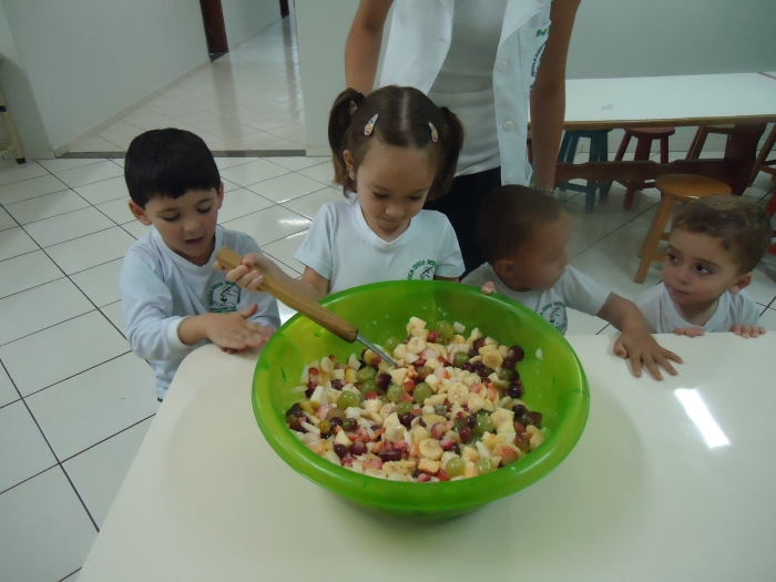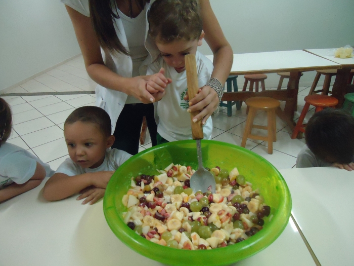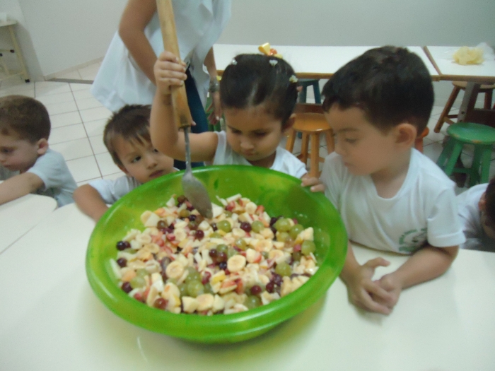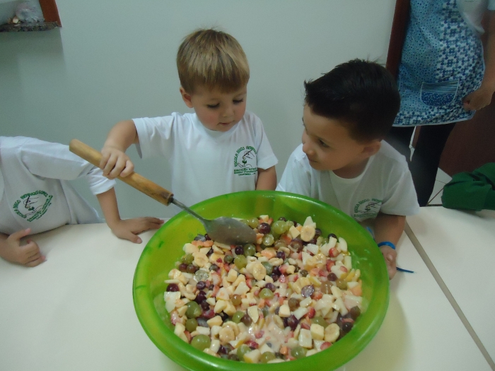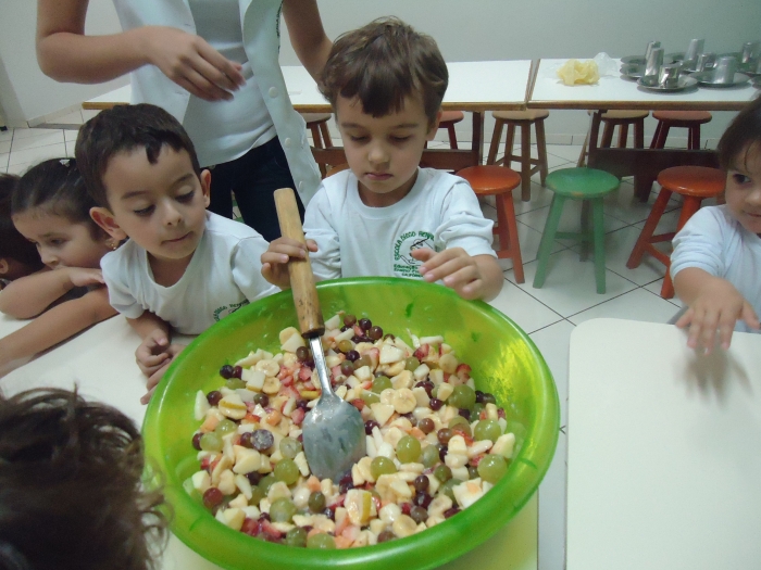 Os Alunos do Maternal e Pré I preparando Salada de Frutas