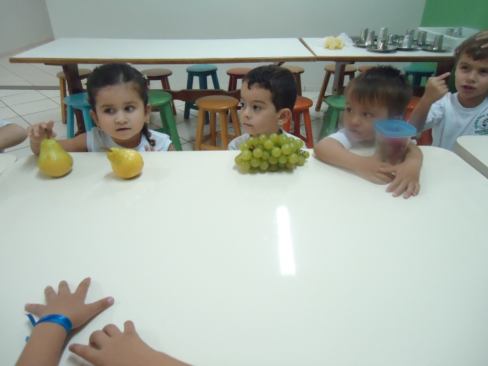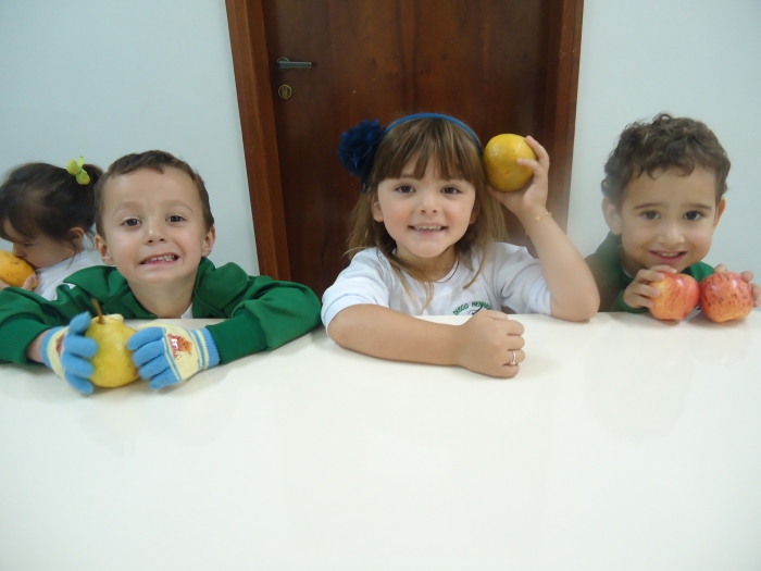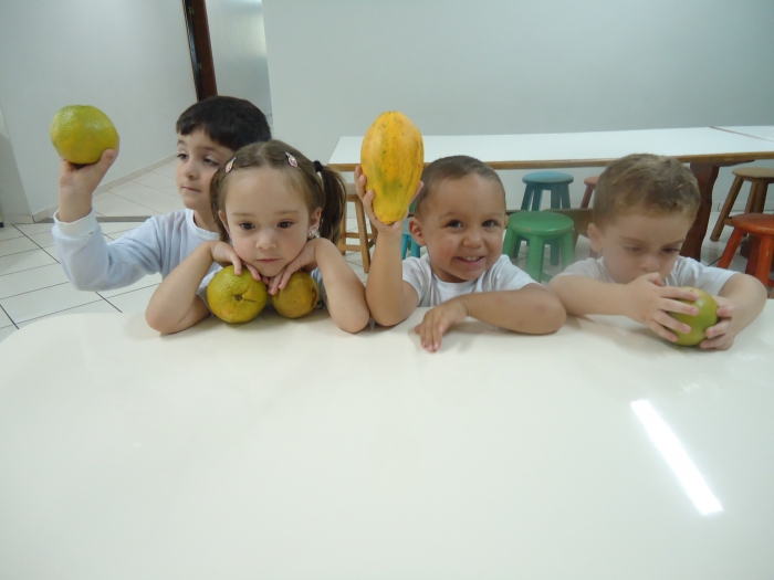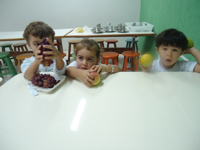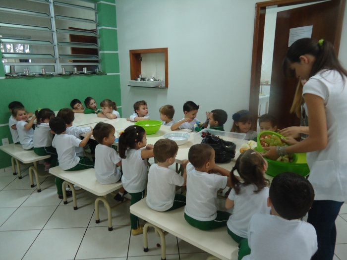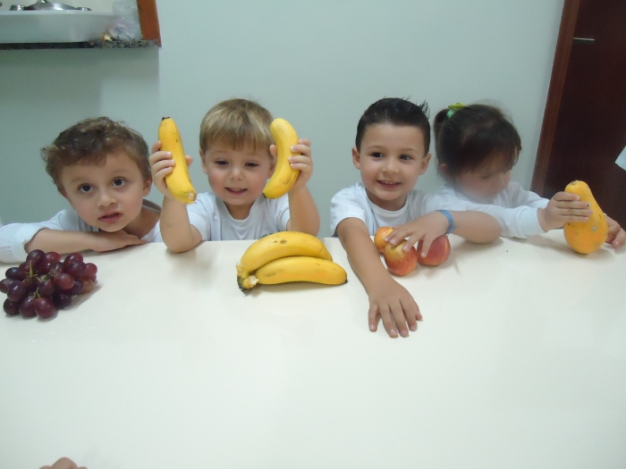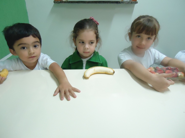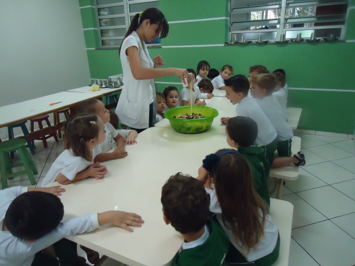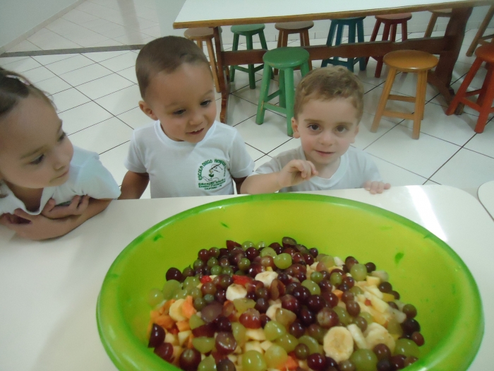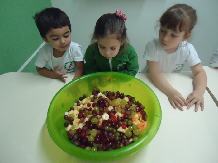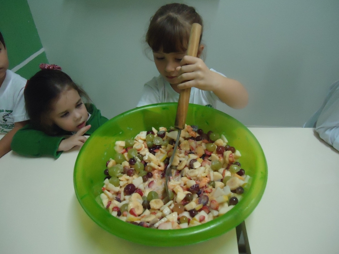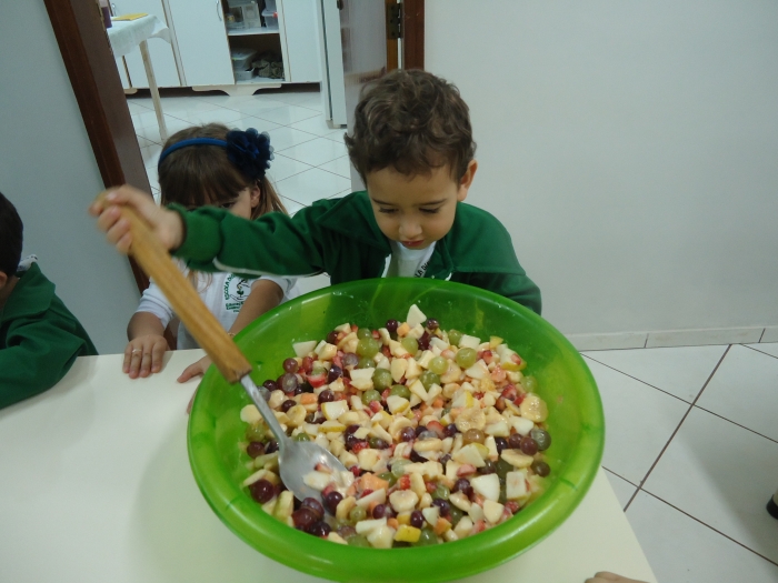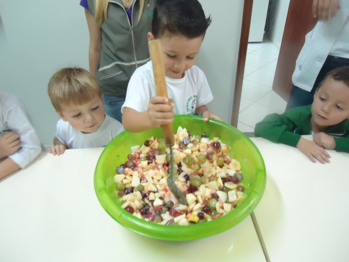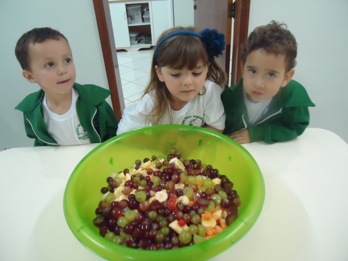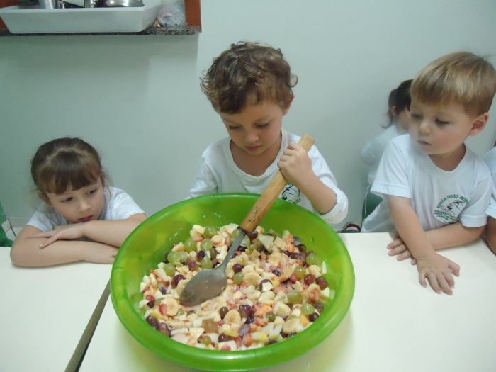 Os Alunos do Maternal e Pré I preparando Salada de Frutas