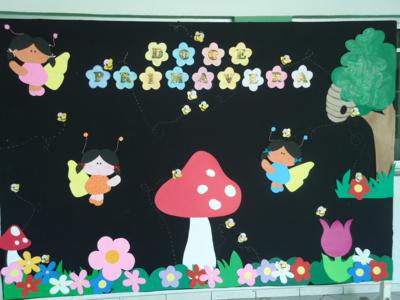 Alunos do 1º ano da professora Sabrina confeccionaram flores e abelhas que formaram o painel da primavera.