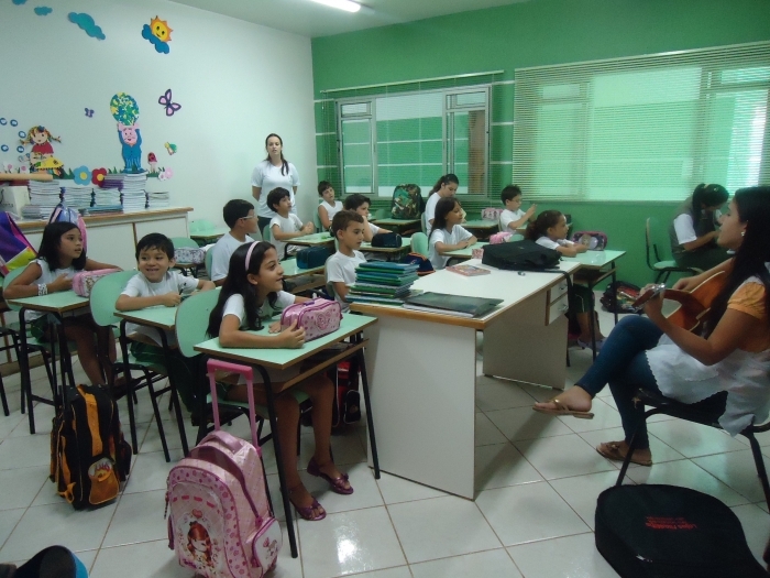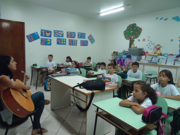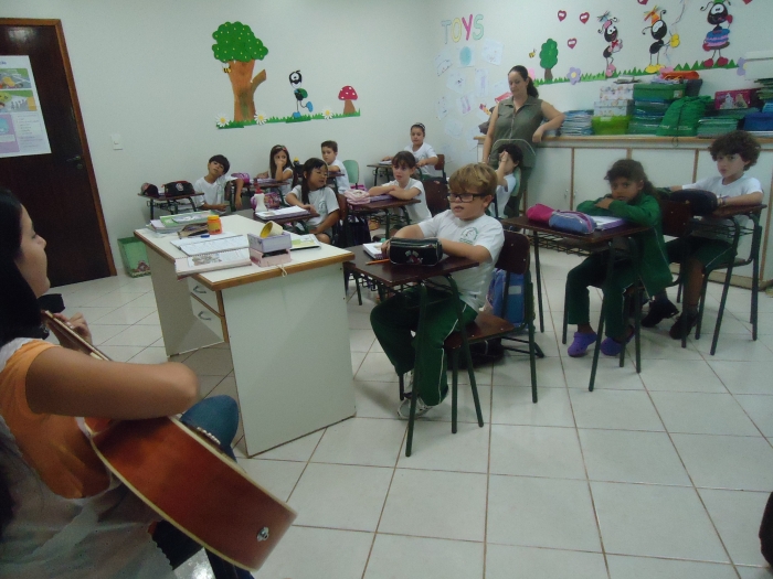 Os alunos do Ensino Fundamental matutino, juntamente com a professora Elissa, nas aulas de musicalização aprenderam a tabuada cantando.