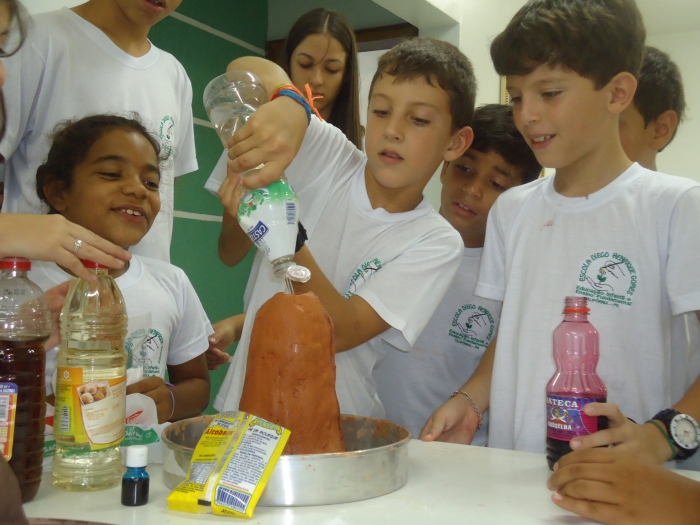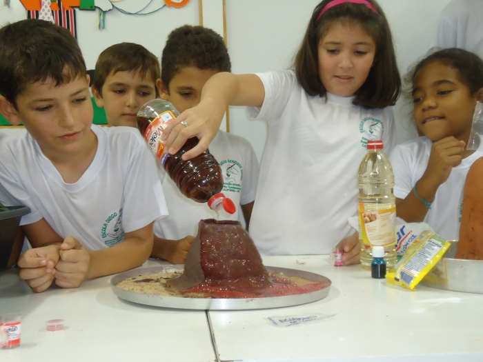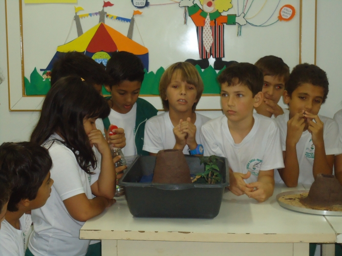Os alunos do 4º Ano fizeram uma demonstração dos vulcões em erupção no refeitório da escola para os alunos e professores do período matutino, onde foram aplaudidos com muito entusiasmo.
