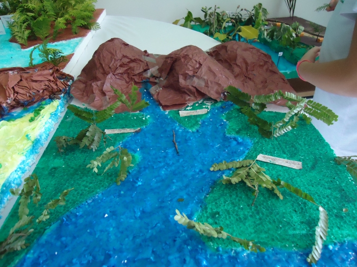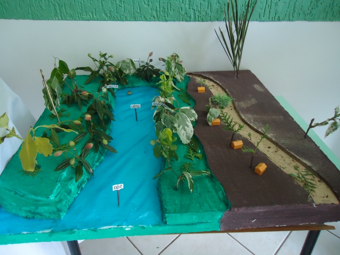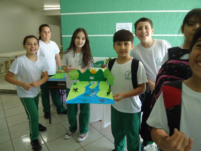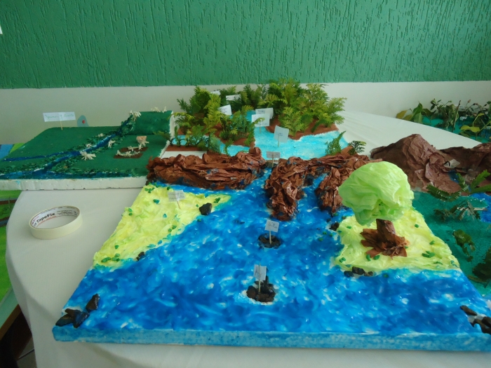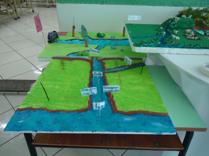 Para ampliar o conhecimento, a professora Rosângela do 5º Ano pediu aos alunos que confeccionassem maquetes, demonstrando o encontro e as partes de um rio, frisando também sua importância para a população.