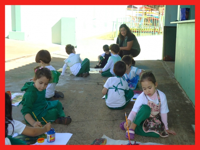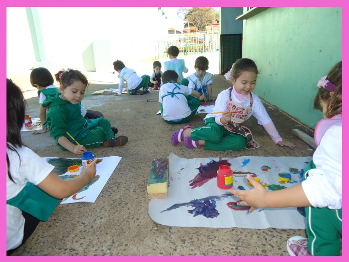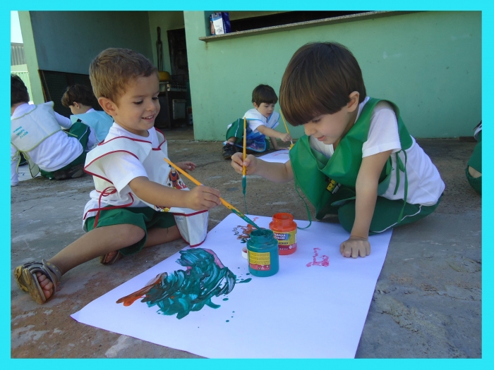 A turminha do Pré I se divertindo na aula de arte, soltando a criatividade na pintura livre, onde as crianças puderam expressar-se de maneira artística, respeitando a criação livre e a individualidade.