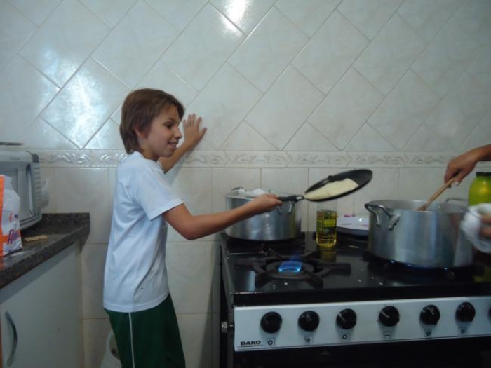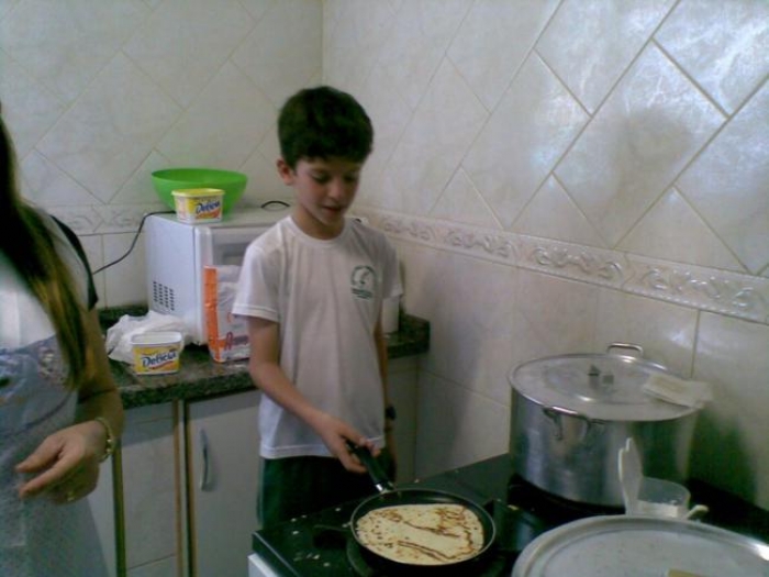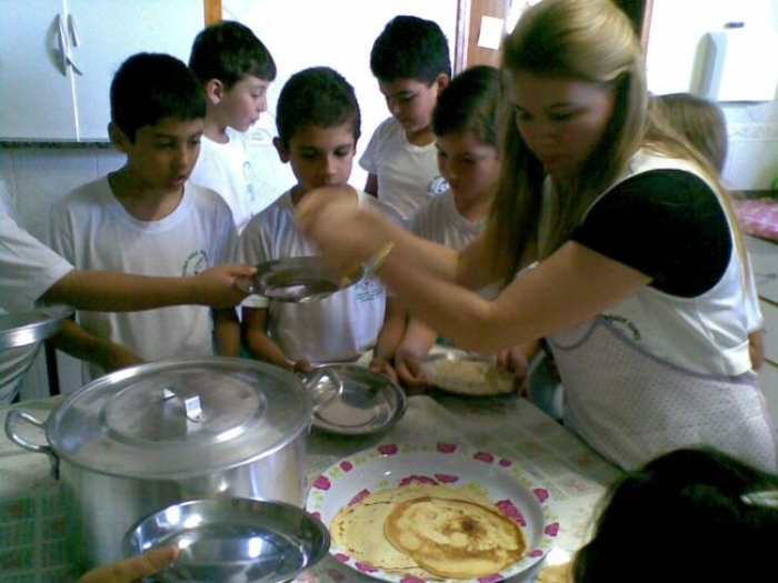Os alunos do 4º Ano do período matutino, juntamente com as professoras Stela e Jéssica e a coordenadora Mariney foram até a cozinha para uma aula de culinária, a qual foram feitas deliciosas panquecas acompanhadas de arroz branco. Cada aluno trouxe um ingrediente com o objetivo de trabalhar receitas e medidas.