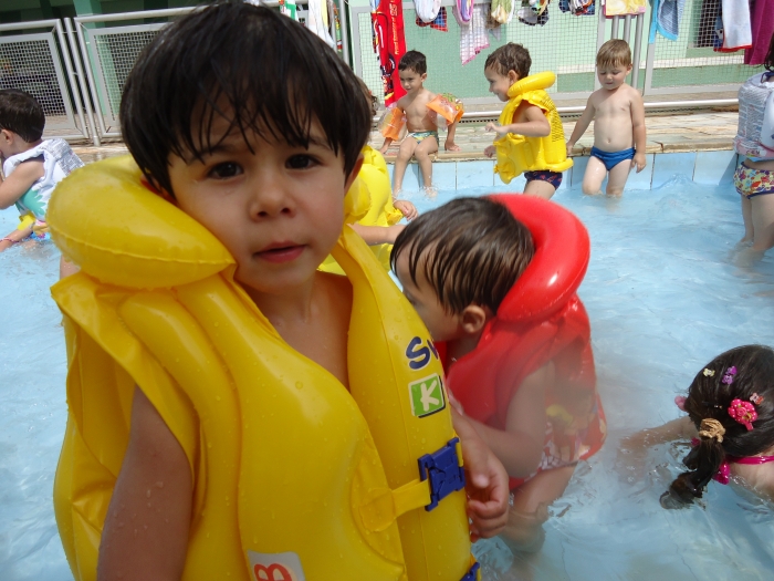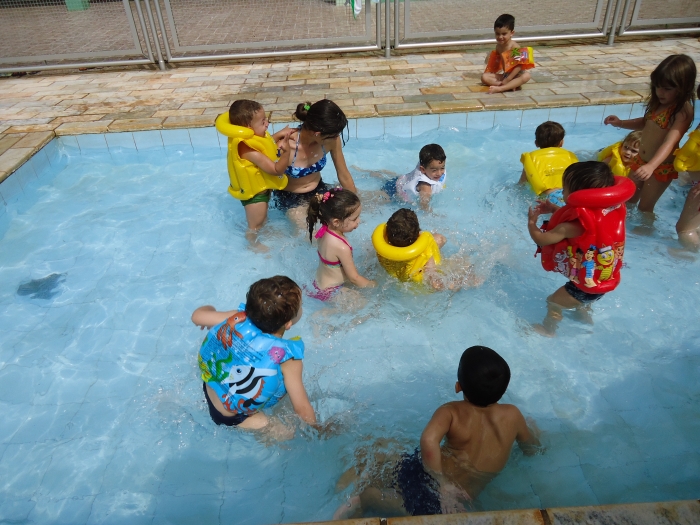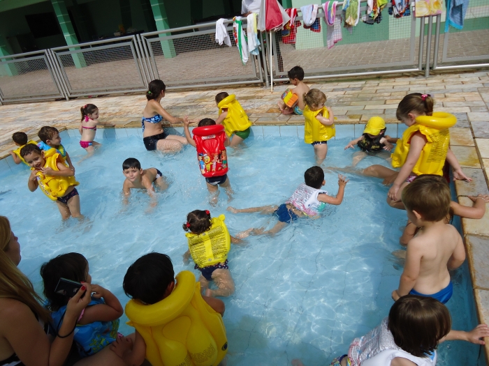 Na piscina brincaram e se divertiram muito e ao mesmo tempo aprenderam que a convivência e comunicação entre eles não acontecem apenas dentro de suas salas, e sim na interação com todos os colegas da escola.