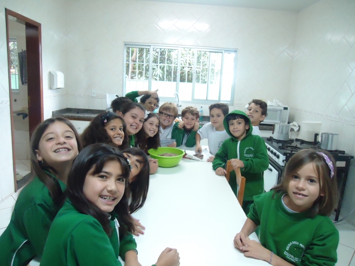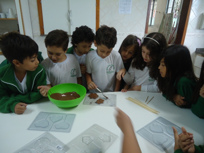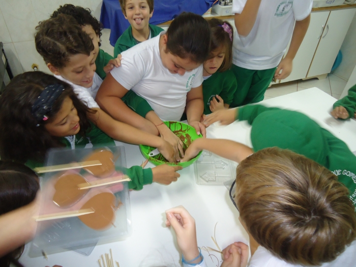 Os Alunos do 3º Ano, na aula de Arte, foram para cozinha junto com a Professora Meire para a confecção de '' Bombons'', fazendo uma aula prática pois estão trabalhando a lenda do chocolate.