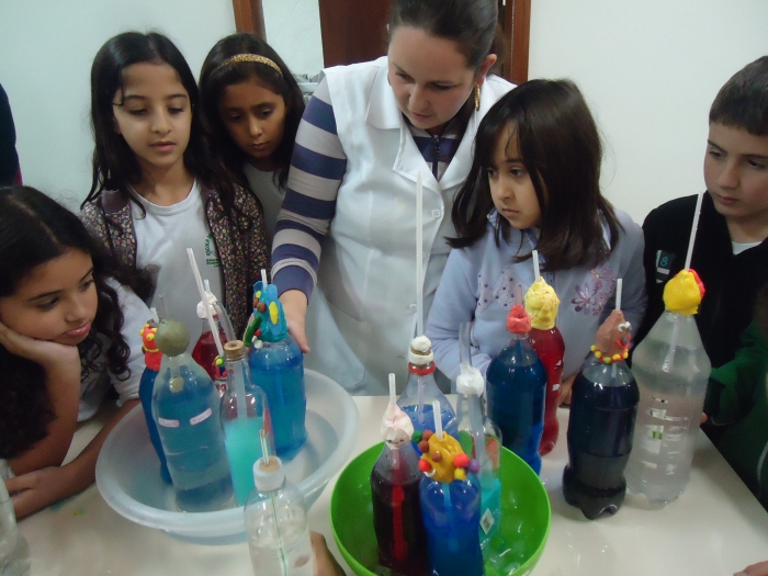 Os Alunos do 4º Ano do Ensino Fundamental, fizeram uma experiência utilizando garrafas, canudos, água quente, etc, para a confecção de um termômetro.