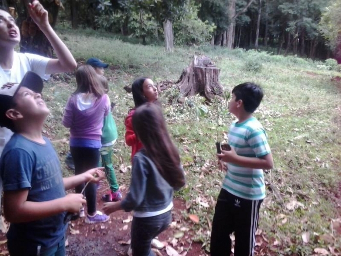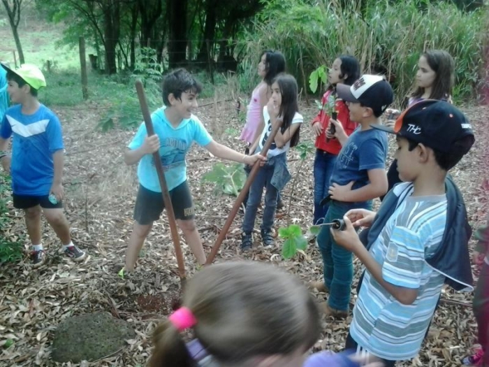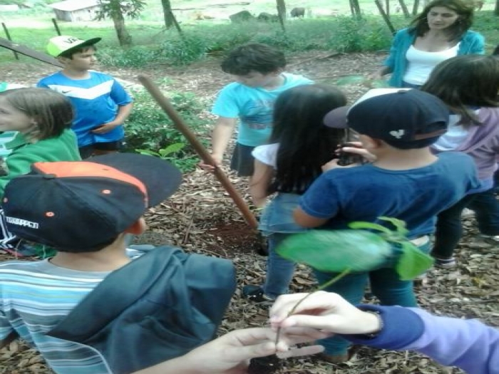 Em duplas os alunos realizaram a plantação de algumas mudas de árvores, conheceram diversos tipos de frutas e visitaram uma nascente de água.