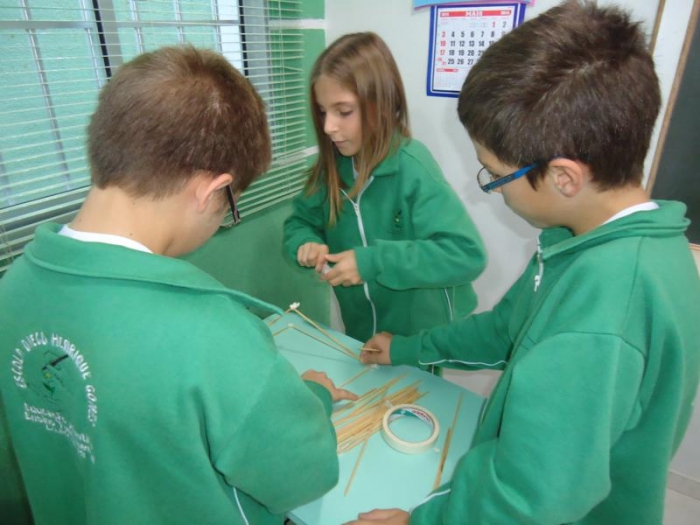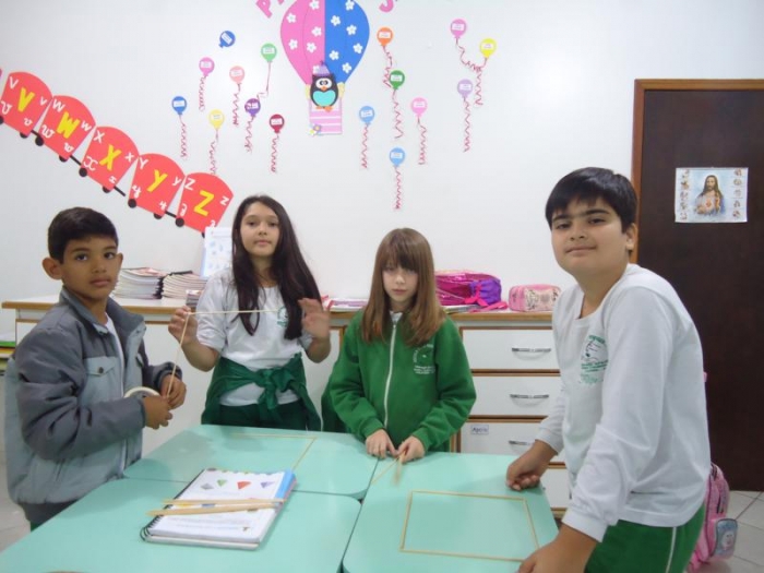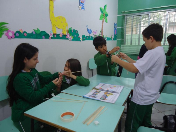 A professora Rosãna do 4º Ano encontrou uma forma diferente de aplicar o conteúdo sólidos geométricos: face, vértice e aresta, de forma lúdica e divertida, usaram palitos e fita adesiva, para que o conteúdo abstrato se tornasse manipulável.