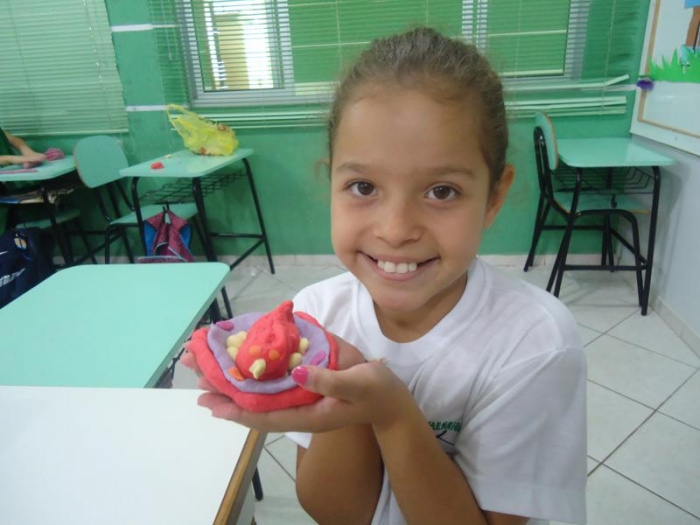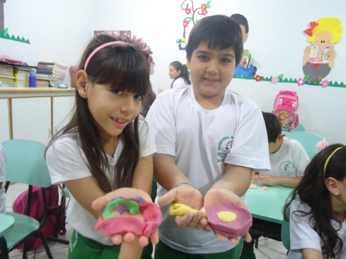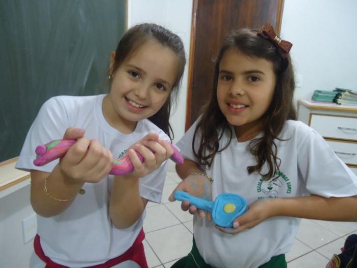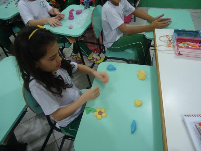A professora Meire proporcionou um trabalho com arte tridimensional, os alunos criaram peças utilitárias, objetos e retrataram cenas do cotidiano, usando massa de modelar feita por eles com a colaboração dos seus familiares.