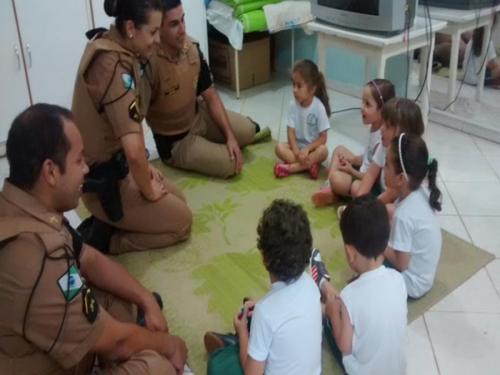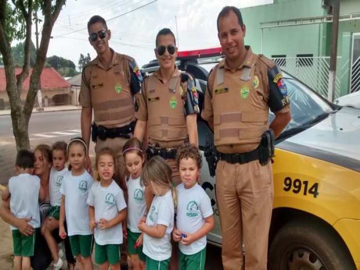 O Sargento Fraga, a policial Mônica e o policial Diego, além da visita carinhosa trouxeram bala para comemorar junto aos alunos o Dia da Criança.