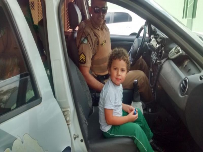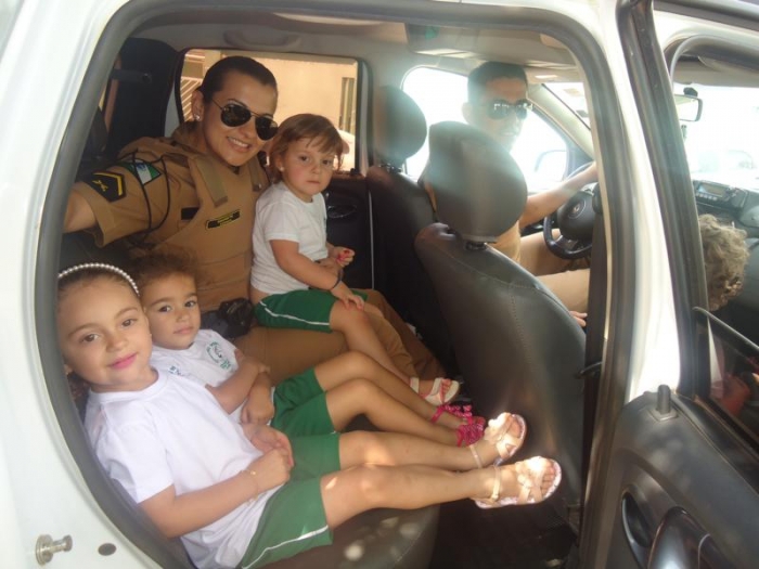 Alguns alunos tiveram oportunidade de entrar na viatura, tirar fotos e ganhar um abraço dos amigos policiais.