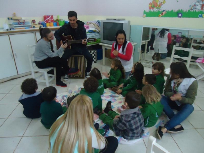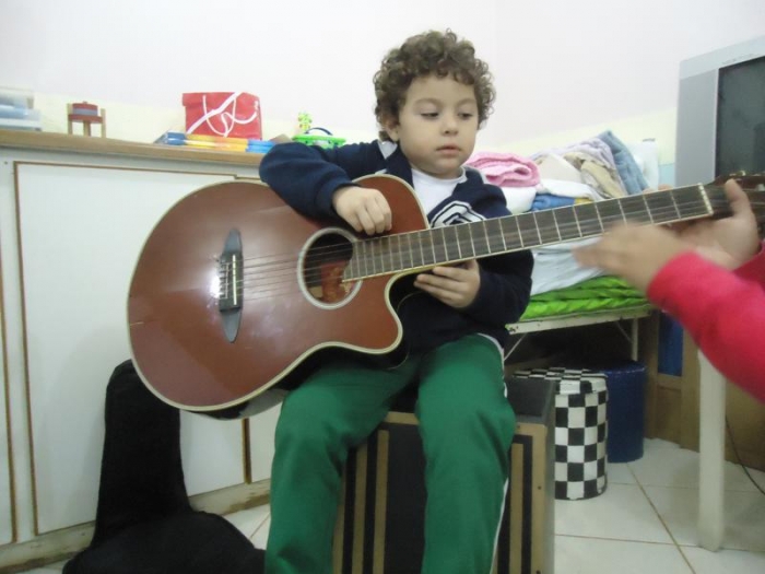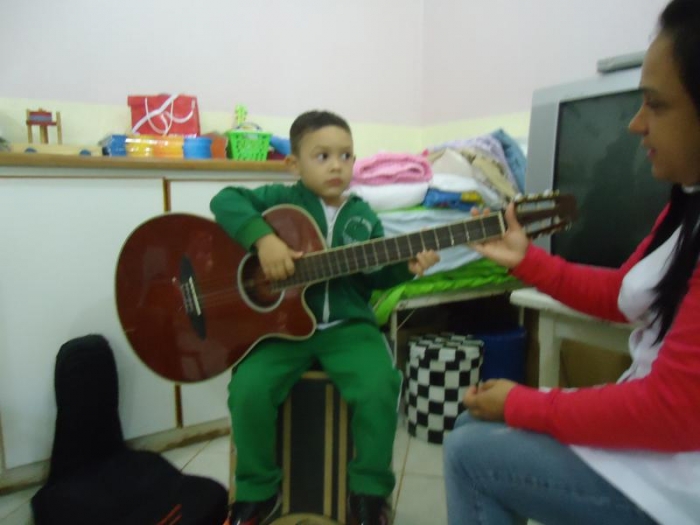 O Mini-Maternal e o Maternal tiveram uma aula muito divertida e animada, com o Vínicius filho da professora Vera, onde puderam tocar o violão e o cajón e cantar várias musicas, na oportunidade a professora Alessandra que já vem trabalhando em sua aula instrumentos musicais, falou um pouco sobre cada um.