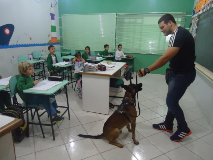 Recebemos a visita do Cão Policial Taz, que faz parte do 10º Batalhão da Polícia Militar. Quem nos honrou com a demonstração e de todo treinamento do Cãozinho foi o soldado Carlos Roberto Clavero Viana Santos (mais conhecido como Soldado Clavero).