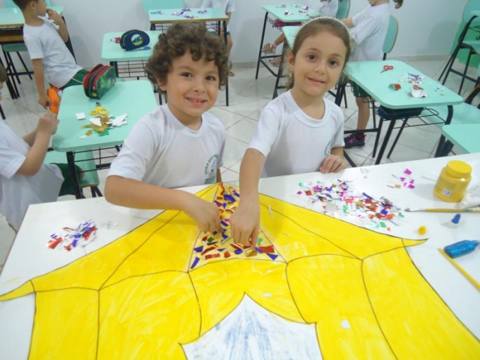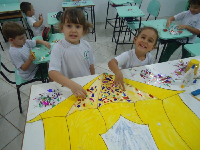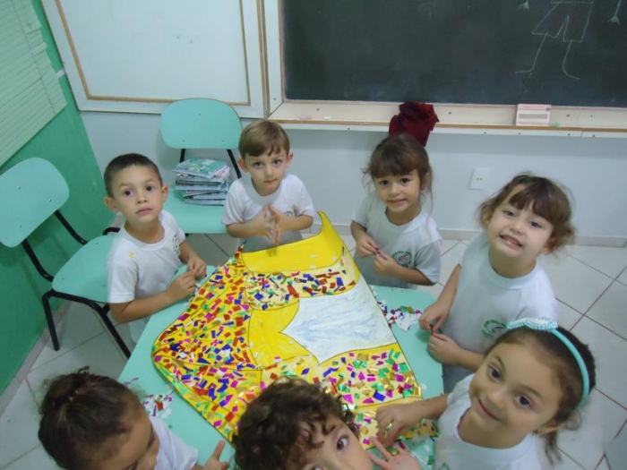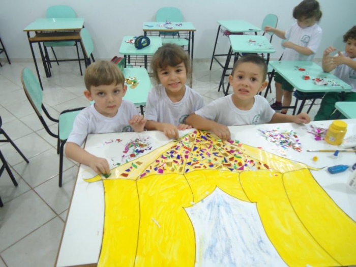 Os alunos se divertiram muito recortando, colando e pintado utilizando as mãos.