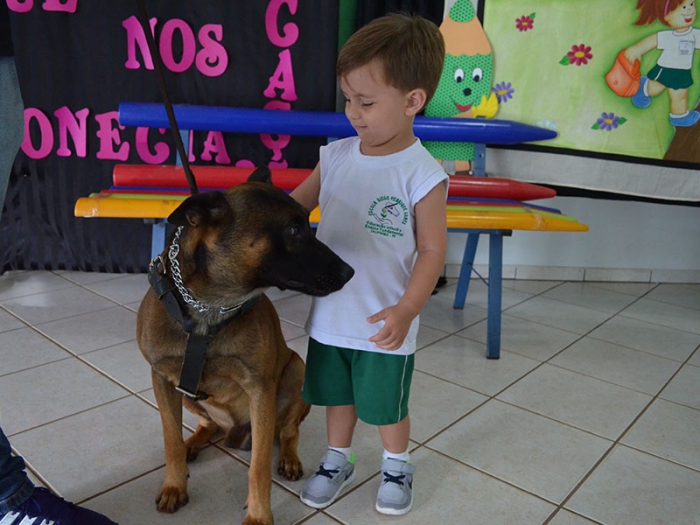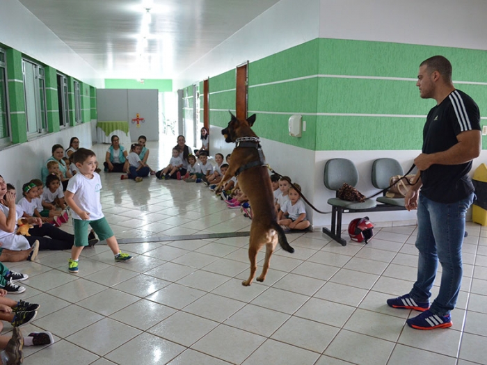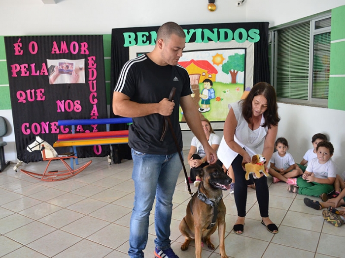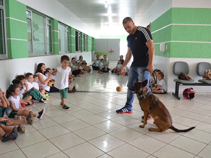 Nesta quarta-feira dia 07 de março, para dar ínicio ao Projeto, recebemos a visita da Soldado Clavero e o cão policial TAZ, onde todos os alunos da tarde participaram e se encantaram com a docilidade e obediência do TAZ.