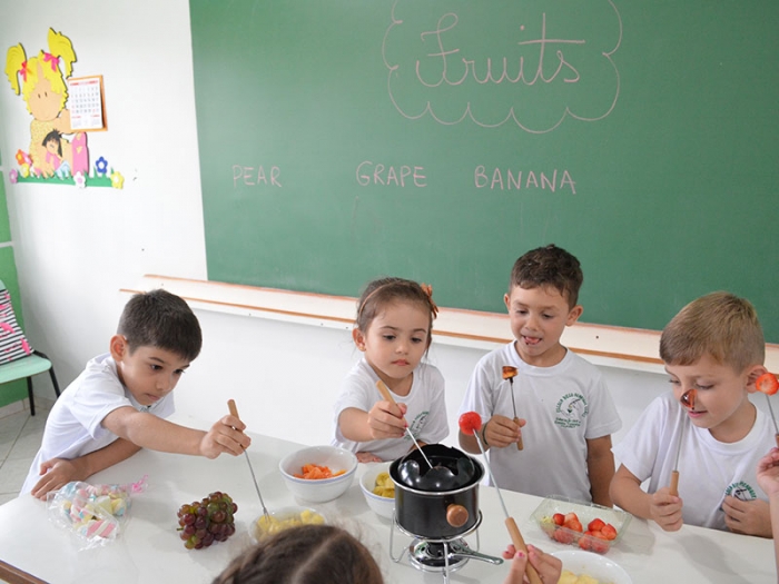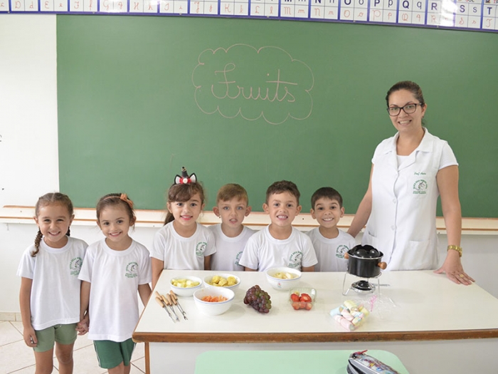 A professora Meire da disciplina de Inglês está ensinando o nome das frutas para os alunos do Pré II. Preparou um ambiente específico para despertar maior interesse e atenção dos alunos, facilitando assim a aprendizagem.