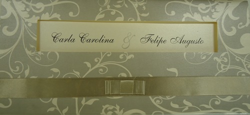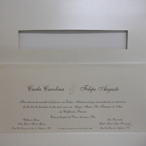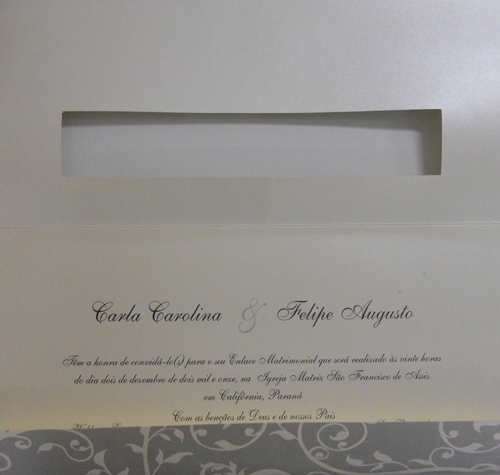 Convite envelope papel Majorca linear com impressão floral externa com corte retangular para visualização dos nomes dos noivos e convite no Majorca liso 180g e impressão em preto.
