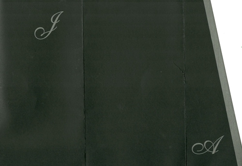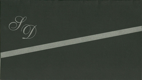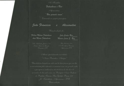 Convite confeccionado em papel Los Angeles, impressão em prata com tarja e iniciais na parte de fora do convite. O proprio convite se torna envelope apos as dobras.